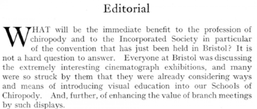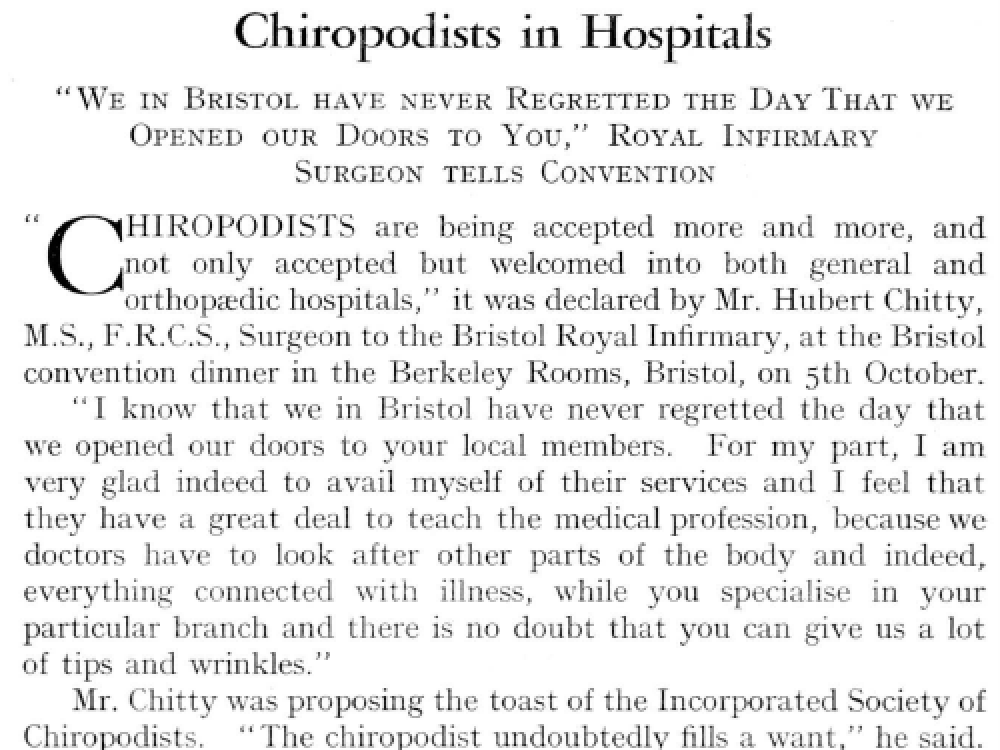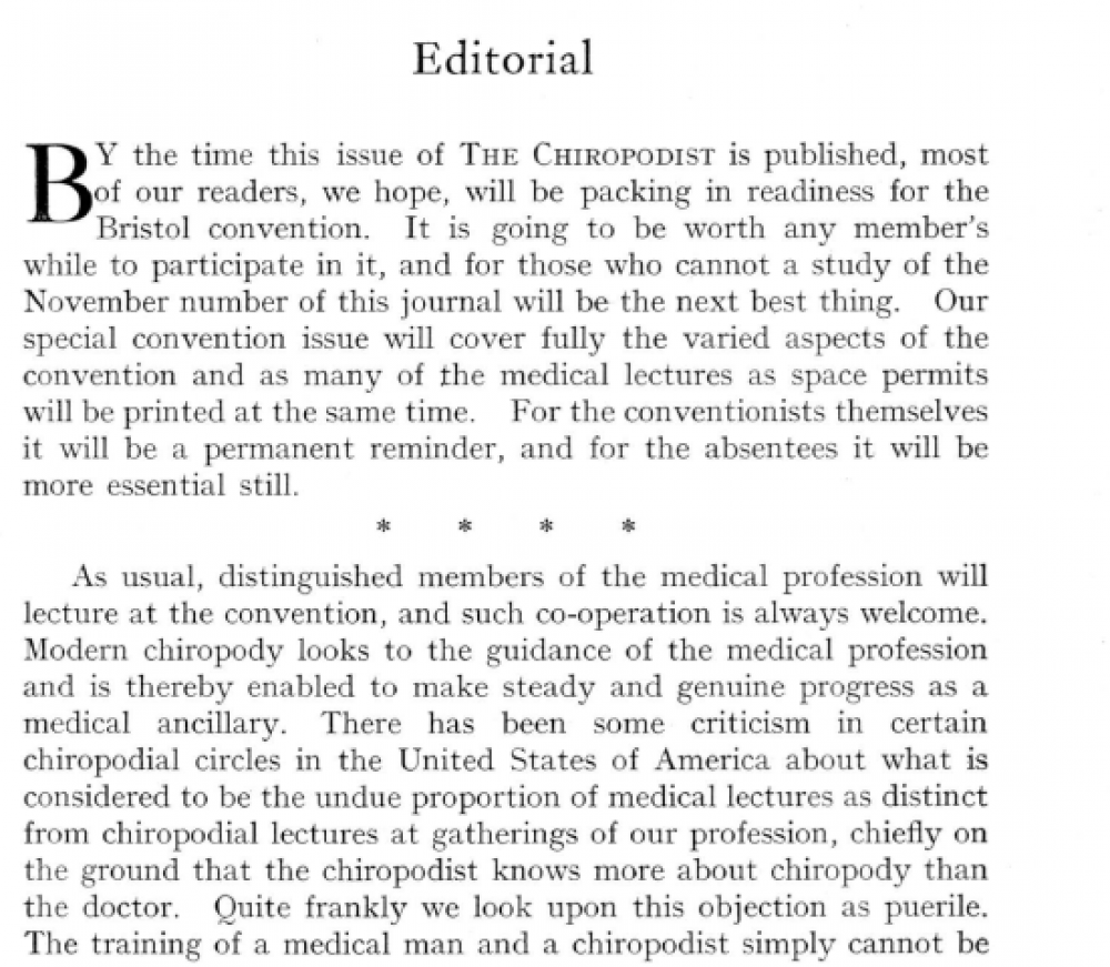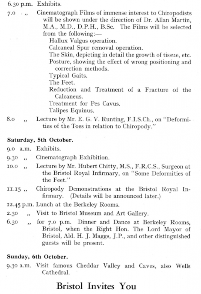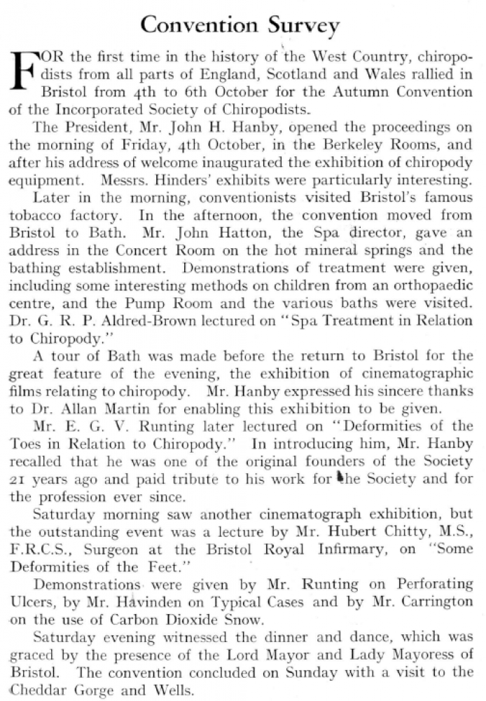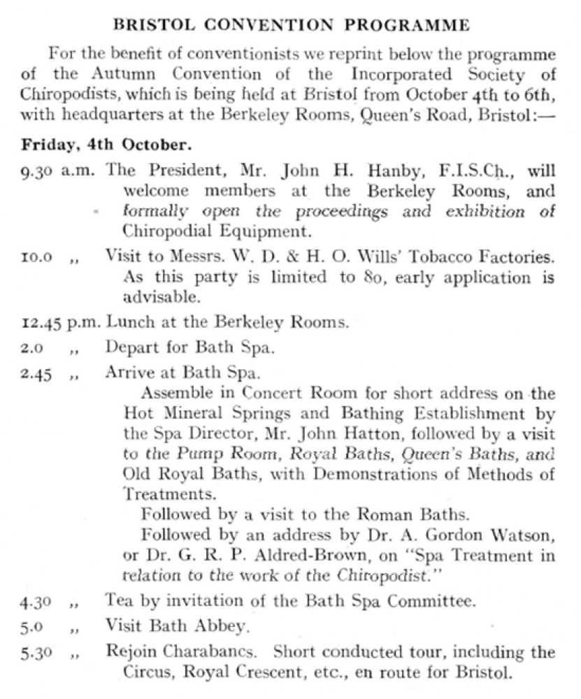 In 1935, the Incorporated Society of Chiropodists (ISC) held its Autumn Convention in Bristol for the first time. This took place between Friday 4 and Sunday 6 October. It was the latest in a regular cycle of conventions that had begun in the early twentieth century. The pattern usually consisted of one main convention in London during the spring then one in the provinces during the autumn. The belief from the President and Council was that holding such provincial conventions would increase the awareness and influence of the ISC across the UK.