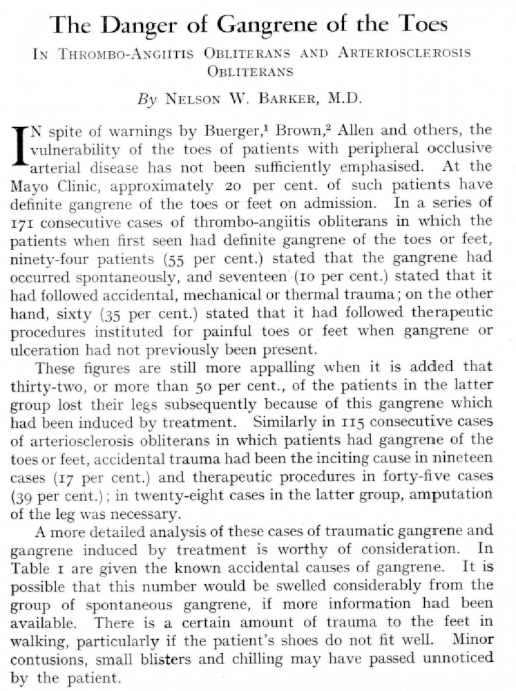 Following this, was a piece by Nelson Waite Barker regarding gangrene of the toes. Barker (1899-1968) was renowned as an expert in vascular trauma, diseases of the blood vessels and circulation. Furthermore, he authored or co-authored more than 200 and chapters in medical textbooks. He did groundbreaking work in establishing the effectiveness of anticoagulant drugs.
