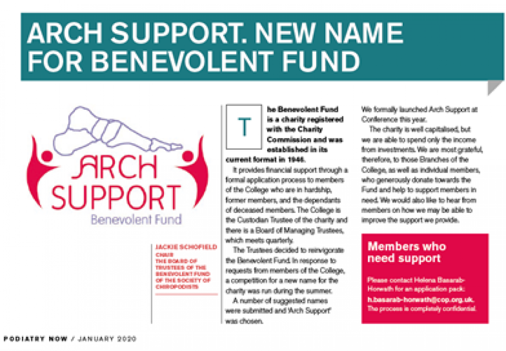 However, in January 2020 it was announced that the Benevolent Fund would henceforth be known as ‘Arch Support’. Its aim is ‘to make grants to any member of The Royal College of Podiatry as defined in the College's Articles, or to the spouse, children, dependants or widow/er of any member or deceased member, who in the opinion of the Trustees, may be in need of assistance.’ It was also registered as a Charity in 2021 and continues to operate under that name. Find out more about Arch Support here.