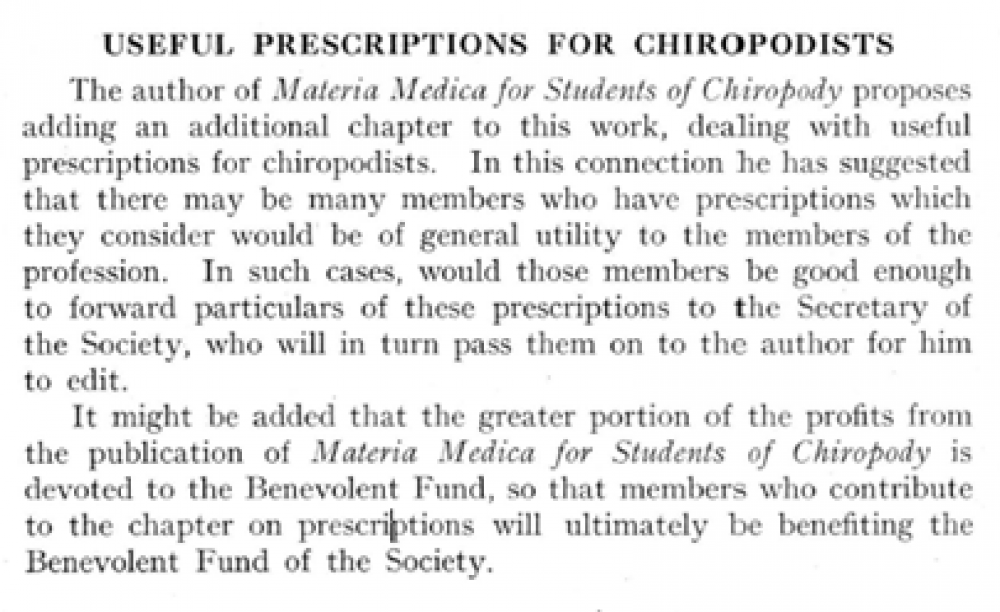- Profits from books sold ie, Materia Medica for Students of Chiropody by OL Carrington in 1937
