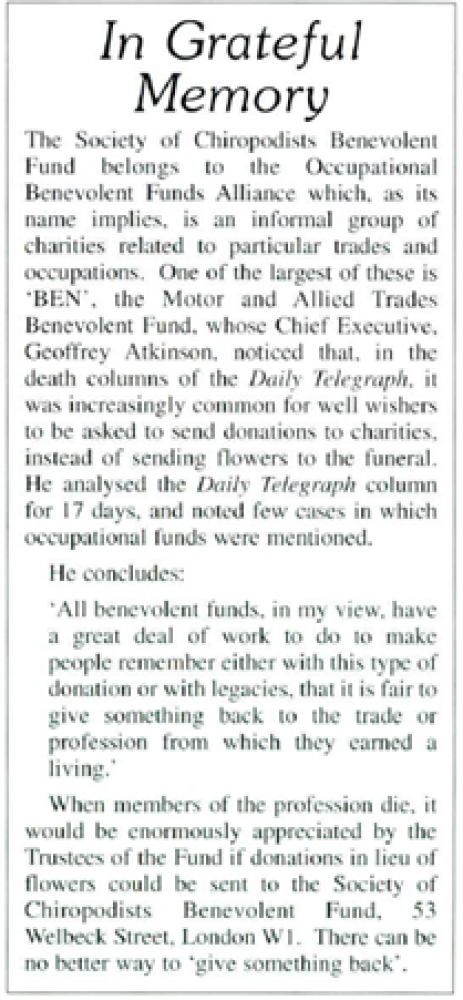 In May 1996 there was a piece highlighting the Occupational Benevolent Funds Alliance and the good work involved. It included a plea for chiropodists donate to the Benevolent Fund instead of sending flowers to members' funerals.
